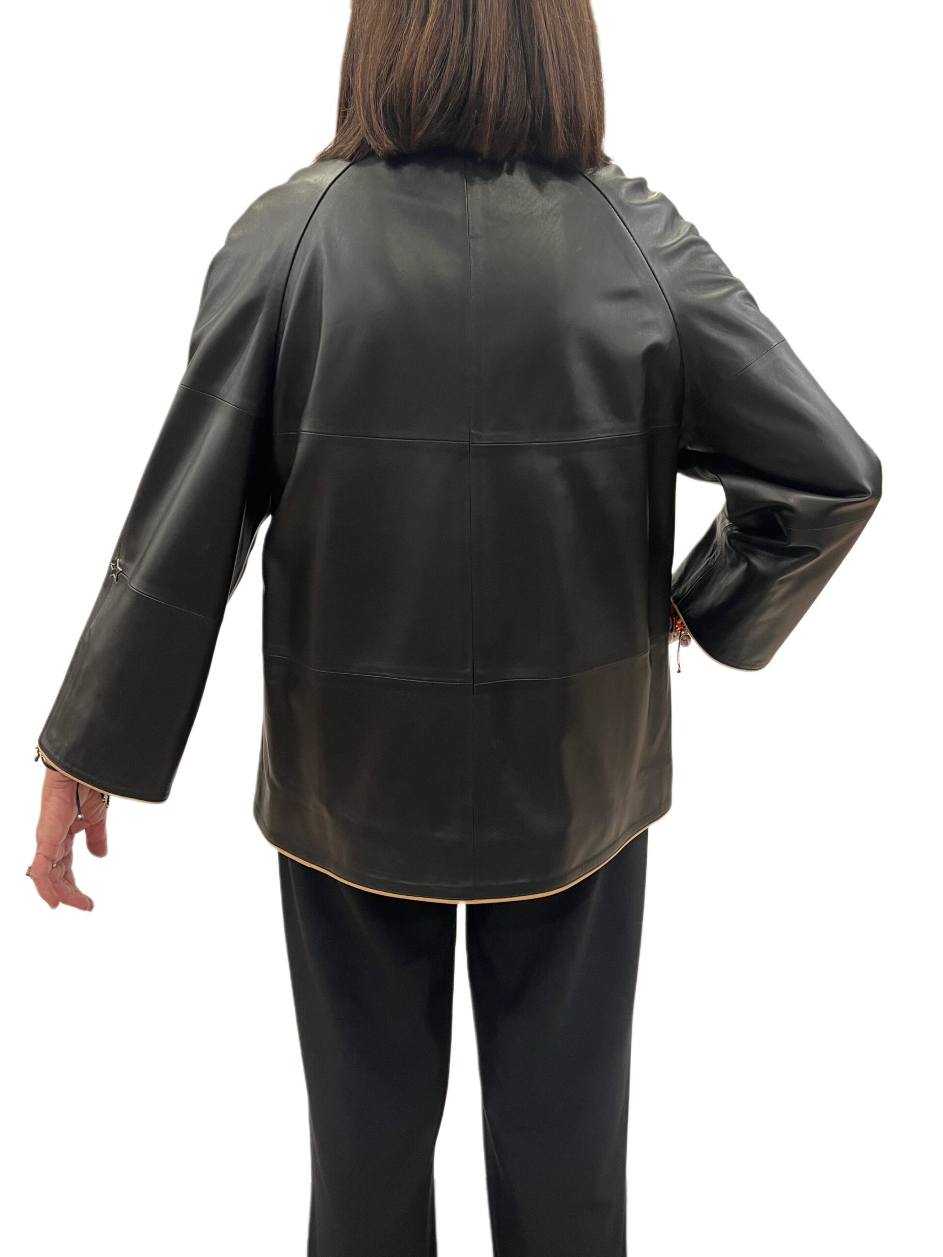 Jaqueta de pell negre amb ribet de color camel i detalls metàl·lics.